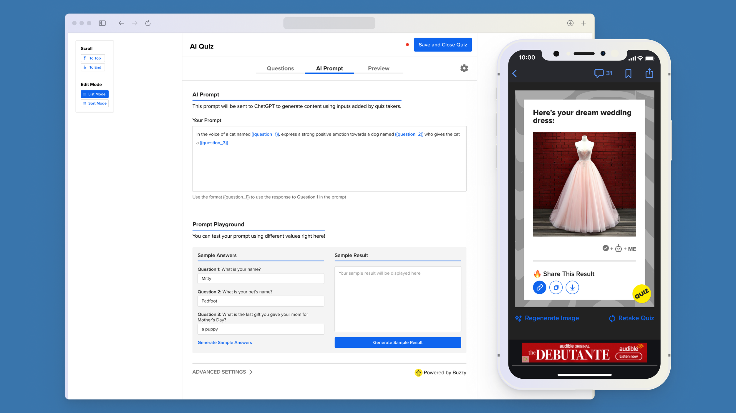 As the design lead for the AI Quiz Builder, I scaled the project from its initial scope—generating unique AI results—into a comprehensive toolset. I prioritized features like the 'prompt playground' and AI-generated image support by balancing them against BuzzFeed's wider AI strategy. By partnering closely with Engineering and Editorial, I created a simplified workflow that allowed writers to experiment with AI prompts within a stable, high-output environment.